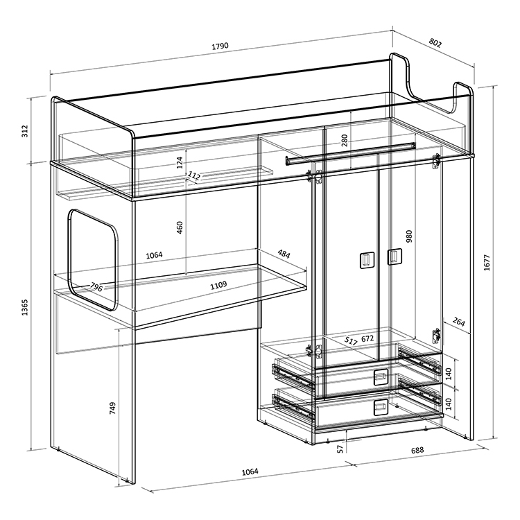 Учебная зона со столом под спальным местом открывает возможности для письменных работ,а также здесь удобно расположить ноутбук.